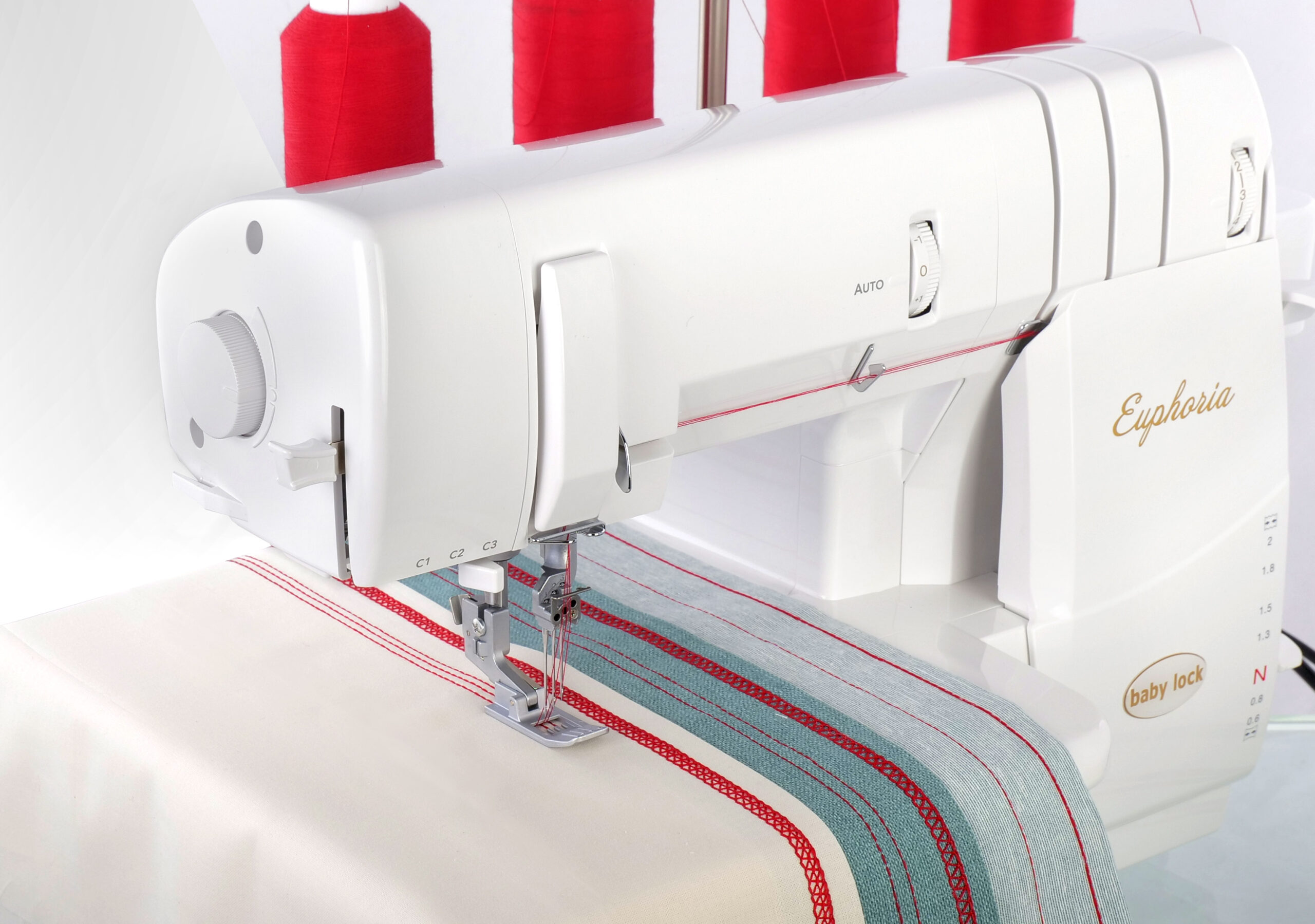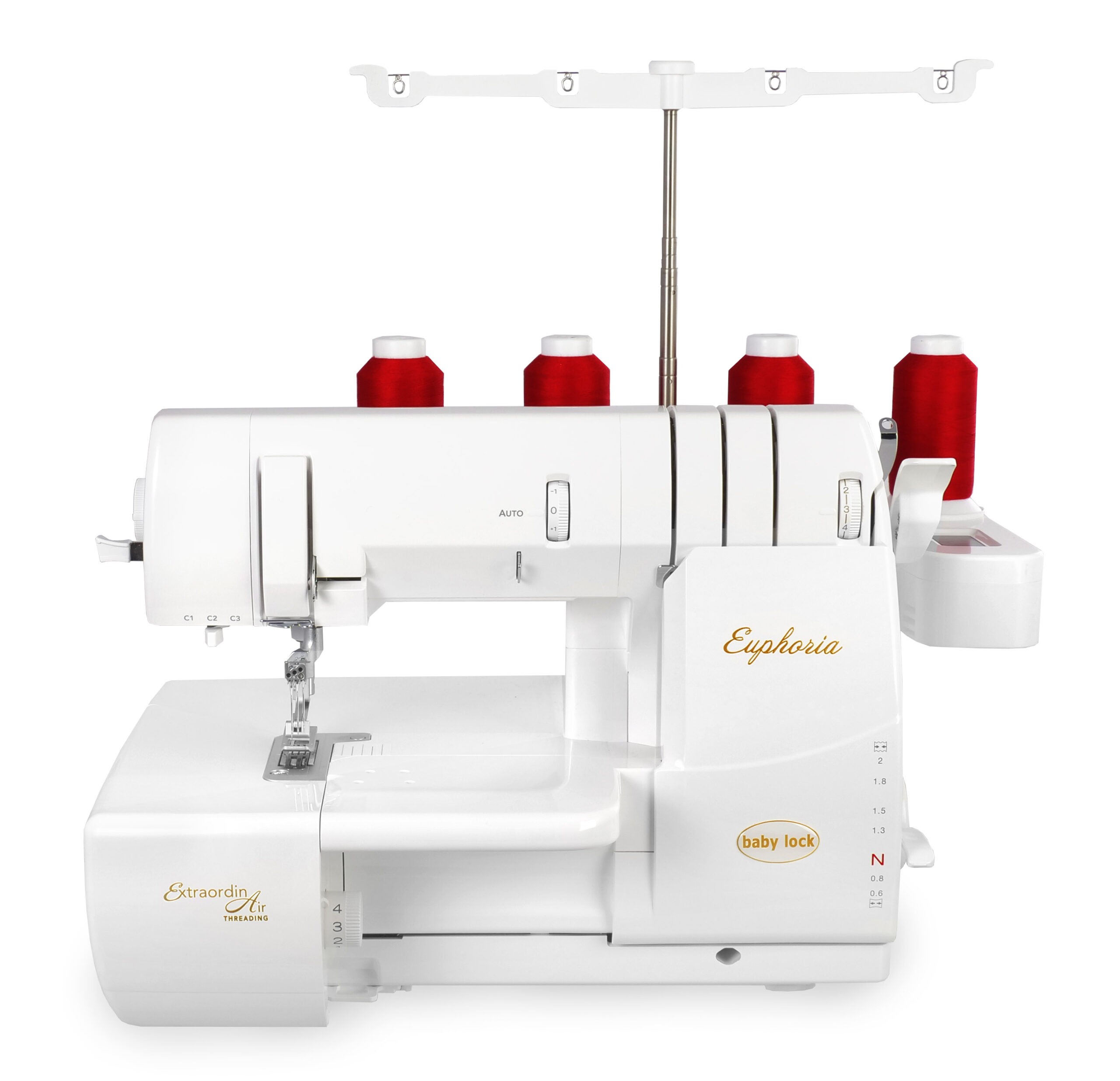 baby lock heeft met Euphoria een covermachine van topklasse gemaakt. De Euphoria heeft bovendien ook de bekende eigenschappen zoals het automatisch draadtoevoersysteem, het luchtinrijgsysteem voor de grijper en een naaldinrijger en grote hoeveelheden stof kunt u met de brede doorlaatopening van 140 mm heel handig verwerken of zelfs met een covernaad versieren. De kniehevel biedt extra hulp bij de stofverwerking. U hebt altijd uw handen vrij om de stof veilig te geleiden. Licht het naaivoetje gewoon met uw knie, of doe hem met uw knie weer omlaag.