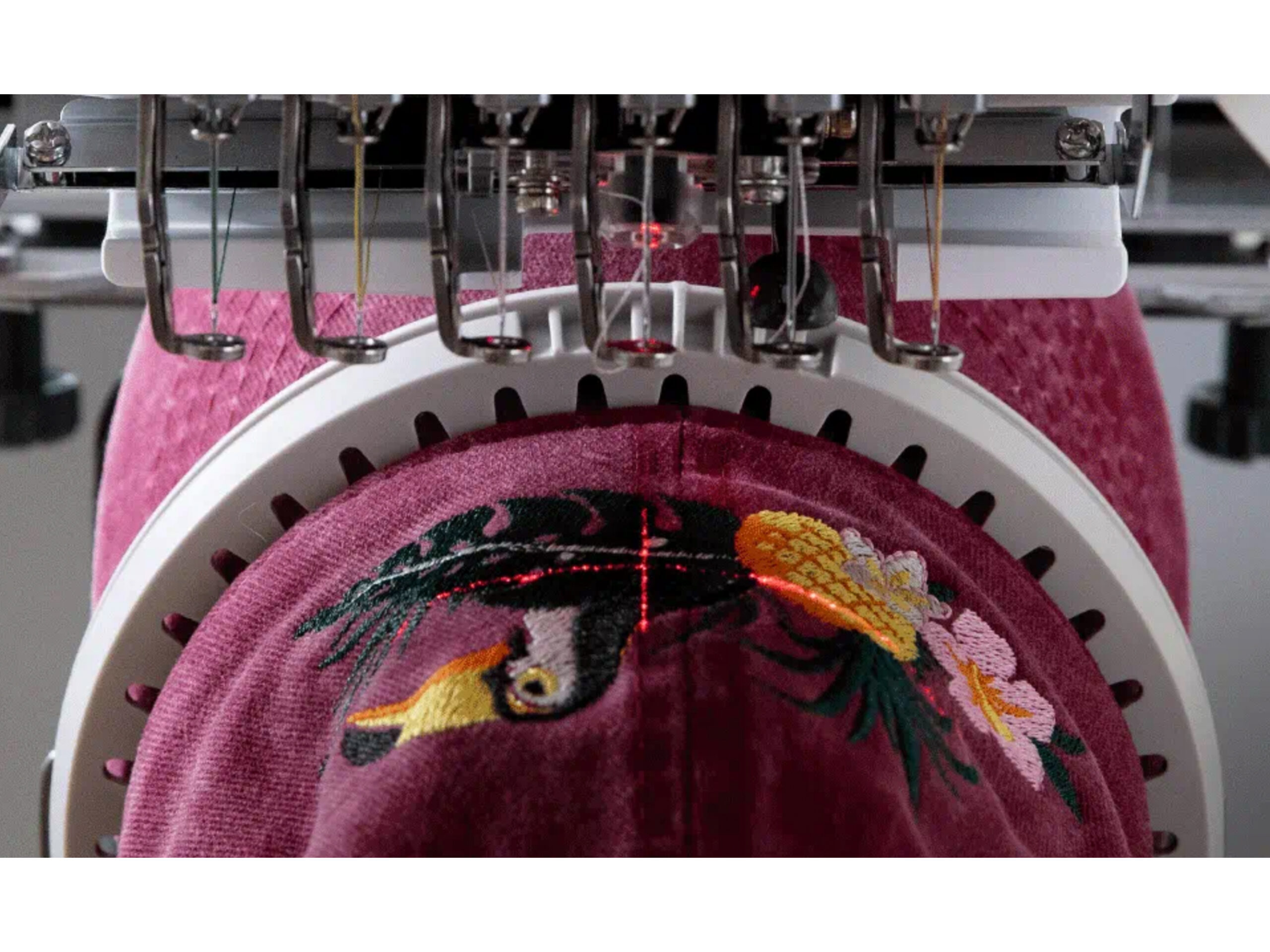 - Laser positioneringskruis voor nauwkeurige bepaling waar de naald moet neerkomen en exacte plaatsing van het borduurpatroon.