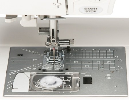 Deze naaimachine is uitgerust met het AcuFeed FlexTM-stoftransportsysteem en een eenvoudig verwisselbare naaldplaat voor betere resultaten bij rechte steken.