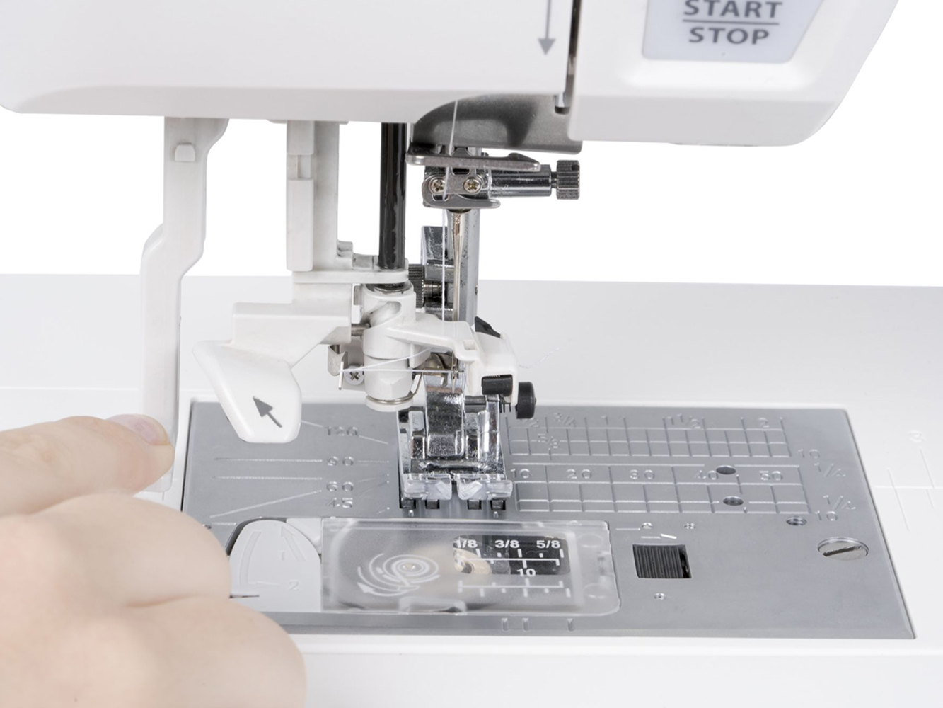 Op het heldere LCD scherm kunt u eenvoudig kiezen uit 120 steken, waaronder 7 automatische knoopsgaten en 3 alfabetten. Open de beschermklep van de naaimachine voor een overzicht van de grote verscheidenheid aan steken met een breedte van 7 mm die tot uw beschikking staan. Daarnaast zorgen de LED verlichting, de uitgebreide accessoires waaronder een extra grote aanschuiftafel, de automatische draadspanning en de automatische draadafsnijder voor extra comfort en een soepele bediening.